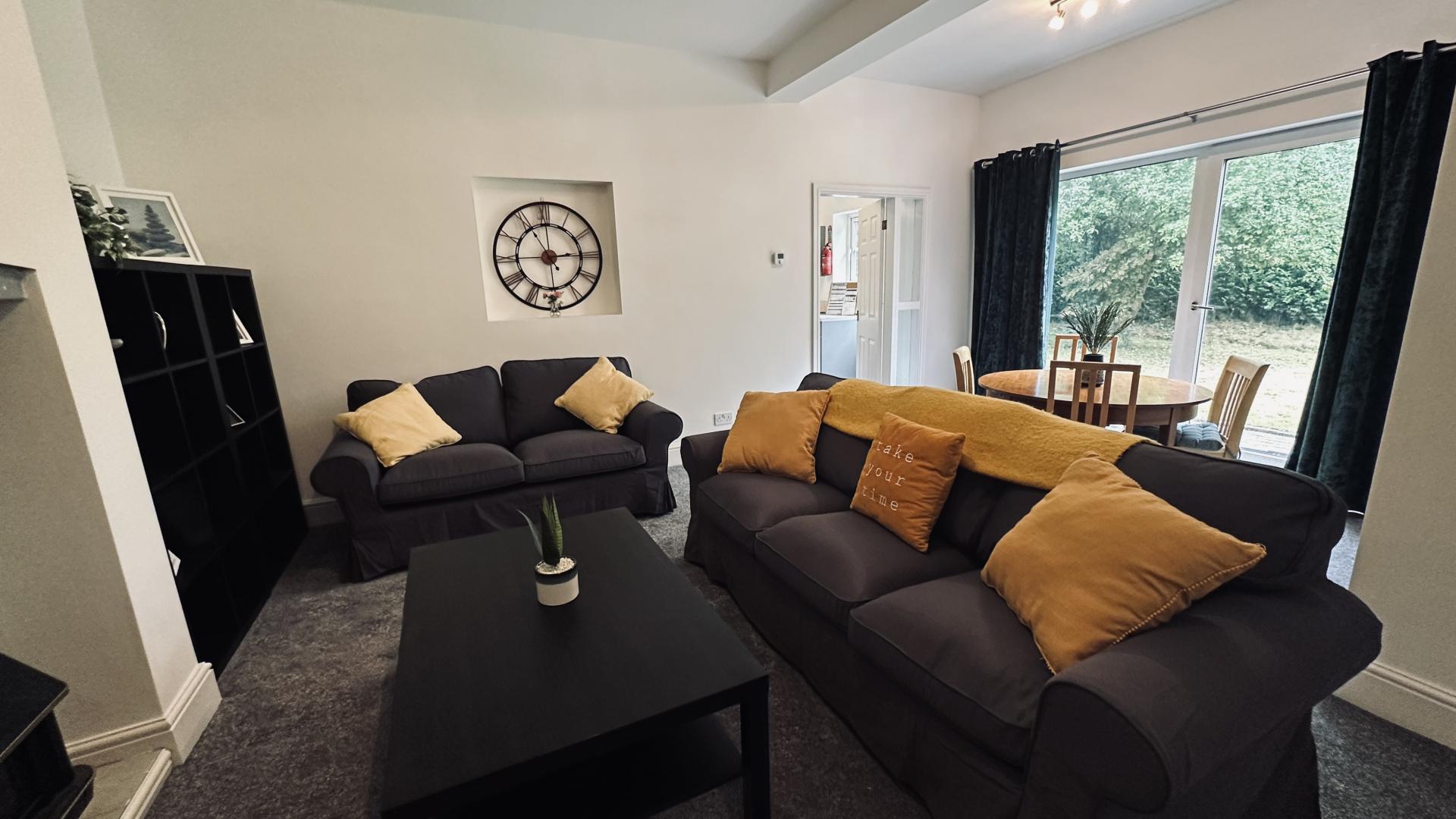 The living room a very cosy space with dining table and chairs with patio doors opening in to a very nice sized garden.